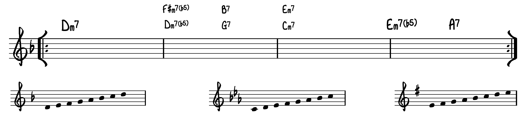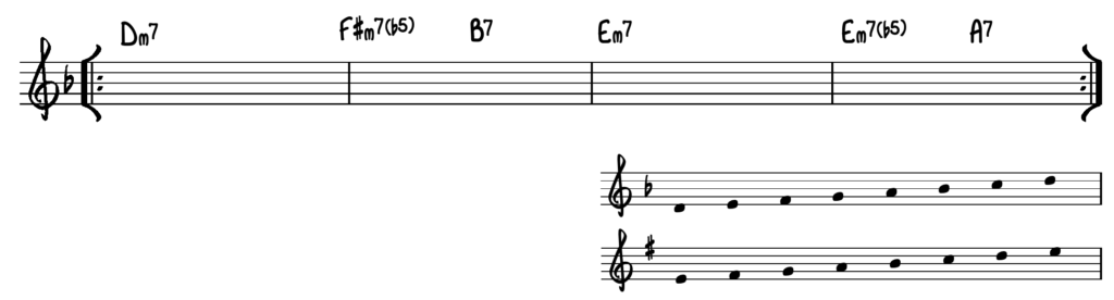 Vi har valgt, at lade opgaverne modulere, ved at anvende 2-5-1 kadencen. Den øverste skala passer til takt 1 & 4 – den nederste skala passer til modulationen i takt 2 & 3.