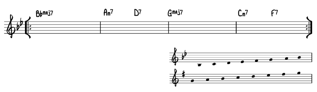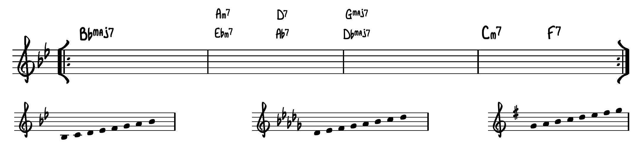 Vi har valgt, at lade opgaverne modulere, ved at anvende 2-5-1 kadencen. Den øverste skala passer til takt 1 & 4 – den nederste skala passer til modulationen i takt 2 & 3.