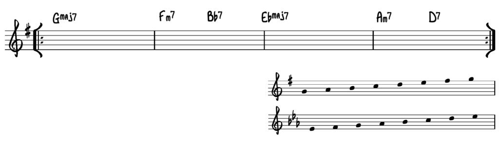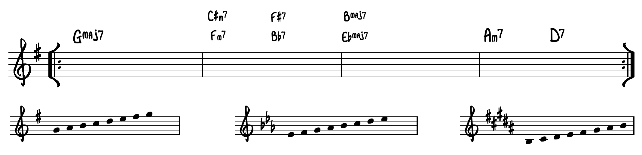 Vi har valgt, at lade opgaverne modulere, ved at anvende 2-5-1 kadencen. Den øverste skala passer til takt 1 & 4 – den nederste skala passer til modulationen i takt 2 & 3.