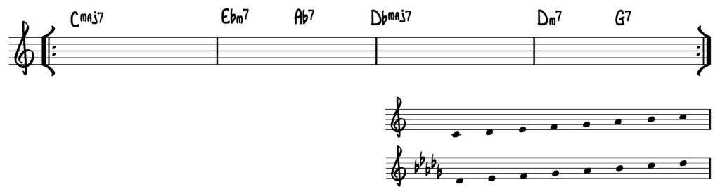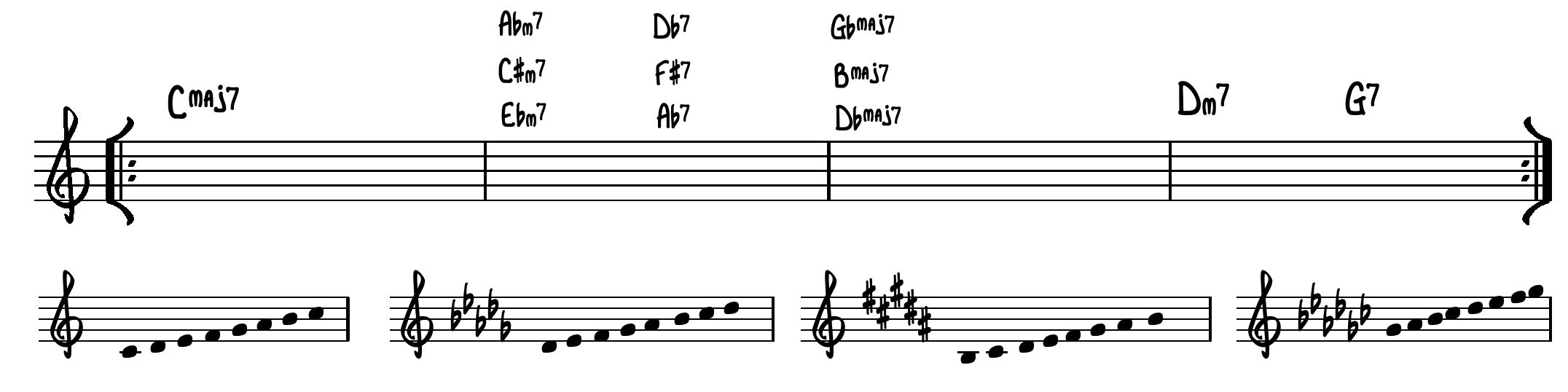 Vi har valgt, at lade opgaverne modulere, ved at anvende 2-5-1 kadencen. Den øverste skala passer til takt 1 & 4 – den nederste skala passer til modulationen i takt 2 & 3.