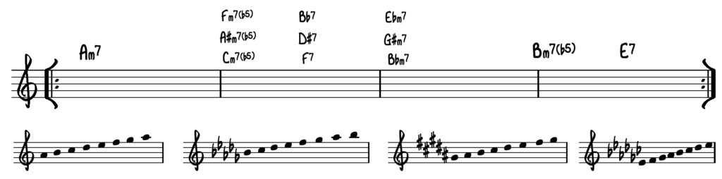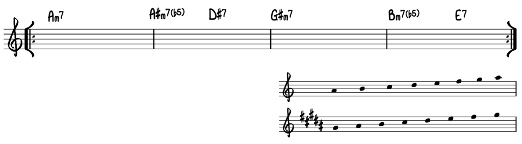 Vi har valgt, at lade opgaverne modulere, ved at anvende 2-5-1 kadencen. Den øverste skala passer til takt 1 & 4 – den nederste skala passer til modulationen i takt 2 & 3.