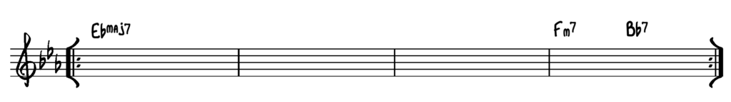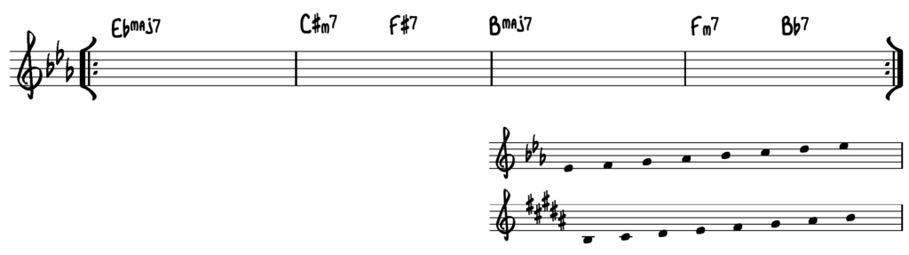 Vi har valgt, at lade opgaverne modulere, ved at anvende 2-5-1 kadencen. Den øverste skala passer til takt 1 & 4 – den nederste skala passer til modulationen i takt 2 & 3.