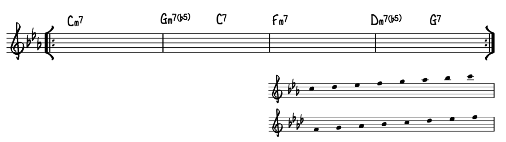 Vi har valgt, at lade opgaverne modulere, ved at anvende 2-5-1 kadencen. Den øverste skala passer til takt 1 & 4 – den nederste skala passer til modulationen i takt 2 & 3.