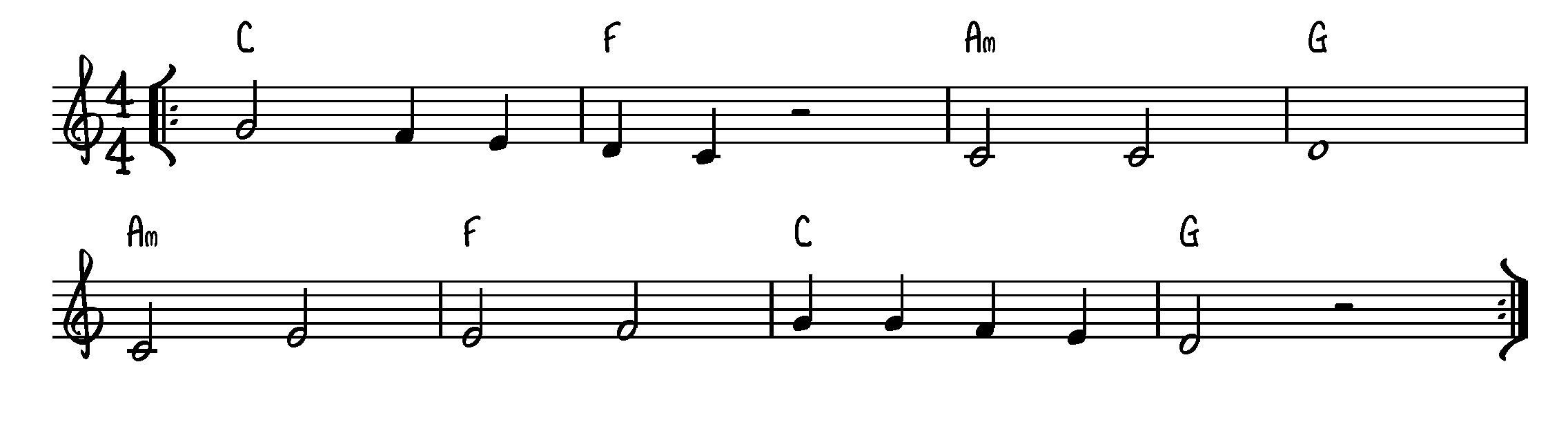 Rytmeværdier: 1/1-, 1/2 og 1/4 dels noder og pauser.